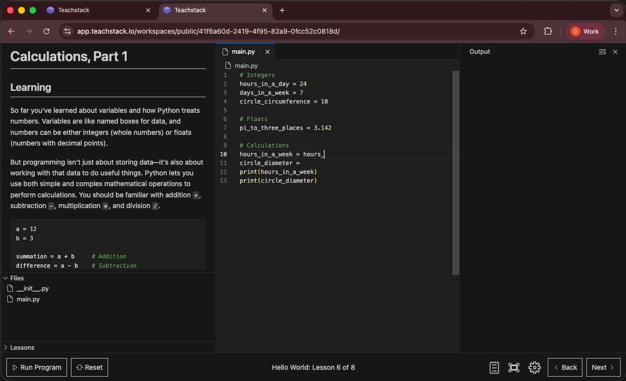 Teachstack lets you build immersive, interactive courses that focus on learning by doing - the most effective way to teach coding. Our platform supports live coding environments, real-time code execution, and gamified challenges that engage students and enhance their learning outcomes.