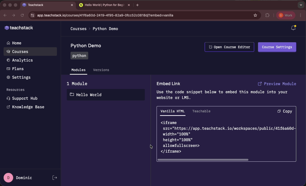 Teachstack is a Software as a Service (SaaS) platform that empowers educators to create, deploy and manage interactive coding courses directly on their own website or learning management system (LMS). We provide the tools and infrastructure to deliver best-in-class, hands-on learning experiences without relying on large platforms that interfere with the relationship between course creator and student.